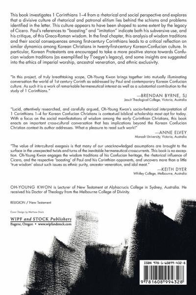 This book investigates 1 Corinthians 1-4 from a rhetorical and social perspective and explores that a divisive culture of rhetorical and paternal elitism lies behind the schisms and problems identified in the letter. This culture appears to have been shaped to some extent by the legacy of Cicero. Paul's references to "boasting" and "imitation" indicate both his subversive use, and his critique, of this Greco-Roman wisdom. In the final chapter, this analysis of wisdom traditions and their social consequences among first-century Corinthians leads to a critical reflection on similar dynamics among Korean Christians in twenty-first-century Korean-Confucian culture. In particular, Korean Protestants are encouraged to take a more positive stance towards Confucian wisdom traditions (as exemplified by T'oegye's legacy), and some insights are suggested into the ethics of imperial worship, ancestral veneration, and ethnic exclusivity.