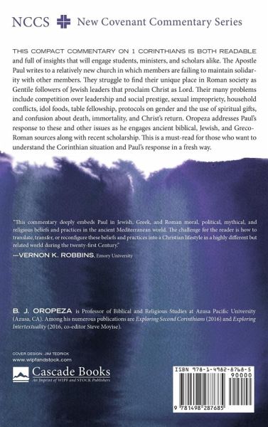 This compact commentary on 1 Corinthians is both readable and full of insights that will engage students, ministers, and scholars alike. The Apostle Paul writes to a relatively new church in which members are failing to maintain solidarity with other members. They struggle to find their unique place in Roman society as Gentile followers of Jewish leaders that proclaim Christ as Lord. Their many problems include competition over leadership and social prestige, sexual impropriety, household conflicts, idol foods, table fellowship, protocols on gender and the use of spiritual gifts, and confusion about death, immortality, and Christ's return. Oropeza addresses Paul's response to these and other issues as he engages ancient biblical, Jewish, and Greco-Roman sources along with recent scholarship. This is a must-read for those who want to understand the Corinthian situation and Paul's response in a new way.