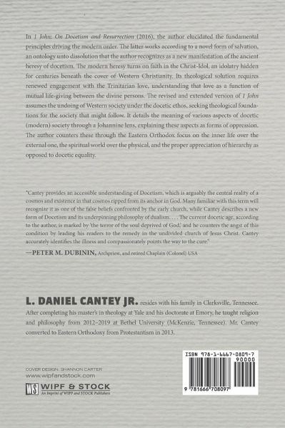In 1 John: On Docetism and Resurrection (2016), the author elucidated the fundamental principles driving the modern order. The latter works according to a novel form of salvation, an ontology unto dissolution that the author recognizes as a new manifestation of the ancient heresy of docetism. The modern heresy turns on faith in the Christ-Idol, an idolatry hidden for centuries beneath the cover of Western Christianity. Its theological solution requires renewed engagement with the Trinitarian love, understanding that love as a function of mutual life-giving between the divine persons. The revised and extended version of 1 John assumes the undoing of Western society under the docetic ethos, seeking theological foundations for the society that might follow. It details the meaning of various aspects of docetic (modern) society through a Johannine lens, explaining these aspects as forms of oppression. The author counters these through the Eastern Orthodox focus on the inner life over the external one, the spiritual world over the physical, and the proper appreciation of hierarchy as opposed to docetic equality.