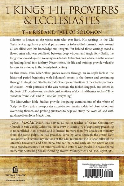 Solomon is known as the wisest man who ever lived. His writings in the Old Testament range from practical, pithy proverbs to beautiful romantic poetry--and all are filled with his knowledge and insights. Yet behind those writings stood a flawed man who was conflicted between deep wisdom and tragic folly. Sadly, the king who warned against so many sins did not follow his own advice, and he wound up leading Israel into idolatry. Nevertheless, his life and writings provide valuable lessons for us today in the twenty-first century. In this study, pastor John MacArthur will guide you through an in-depth look at the historical period beginning with Solomon's ascent to the throne and continuing through his tragic end. Studies include close-up examinations of the vital importance of wisdom--with portraits of the wise woman, the foolish sluggard, and others in the book of Proverbs--and careful considerations of doctrinal themes such as "True Wisdom from God" and "A Time for Everything." --ABOUT THE SERIES-- The MacArthur Bible Study series is designed to help you study the Word of God with guidance from widely respected pastor and author John MacArthur. Each guide provides intriguing examinations of the whole of Scripture by examining its parts and incorporates: Extensive, but straight-forward commentary on the text. Detailed observations on overriding themes, timelines, history, and context. Word and phrase studies to help you unlock the broader meaning and apply it to your life. Probing, interactive questions with plenty of space to write down your response and thoughts.
