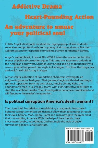 1 Law 4 All - Vegas This second book in the 1 Law 4 All series dives into the heart of political corruption with a remarkably diverse band of characters. Vegas dances from adventure to adventure beginning with the mysterious disappearance of Mark's twin sister, Janelle. From American Samoa, Kitiona calls on her 1 Law 4 All Foundation pals to investigate. The fledgling 1 Law 4 All Foundation parleys the missing person's report into a web of political deceit. Soon they are confronted with overtones from the American and Asian mobs and a Fast and Furious, Mexican cartel. With Las Vegas as ground zero, the Foundation tries to solve the mysteries surrounding Janelle. The threats of murder and the realities of gun battles stimulate the adventurous overflow. How will the Jimmy and the Foundation pioneers avoid tragedy? Or will they? 1 Law 4 All - Vegas mingles drama and intrigue with realistic people-like characters. Jimmy and the Foundation members team with LVPD detective Rick Rizzo to track Janelle's missing person's clues through the American Southwest, China and on to Washington, DC. A senior Senator plays the political system becoming rich along the way. His above the law attitude combines with a lifestyle of drugs and sex. One night he makes a decision he's made many times before. But this cover up attempt leads to scheming, mayhem and murder.