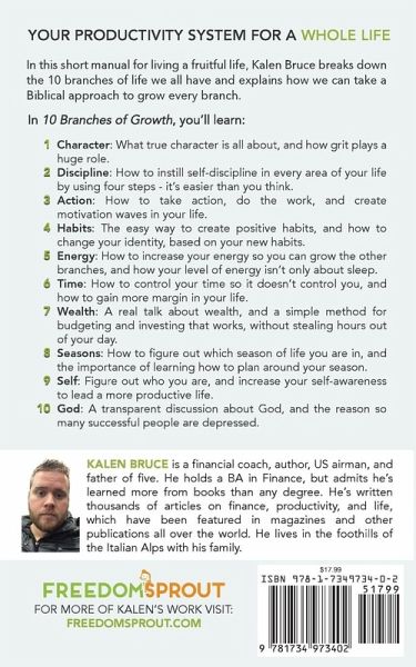 10 Branches of Growth is about living a fruitful life of growth. Kalen Bruce, financial coach and world traveler, gives a concise explanation of how to live a better life. In this short manual for living, Kalen breaks down the 10 branches of our life and explains how we can take a Biblical approach to grow every branch. In 10 Branches of Growth, you'll learn: Character - How character makes up who you are, what true character is all about, and how grit plays a huge role in your character. Discipline - How to instill self-discipline in every area of your life by using 4 steps that are easier than you think. Action - How to take action, do the work, and create motivation waves in your life. Habits - The easy way to create positive habits, and how to change your identity based on your new habits. Energy - How to increase your energy so you can grow the other branches, and how energy isn't just about sleep. Time - How to control your time so it doesn't control you, and how to gain more margin in life. Wealth - A real talk about wealth, and a simple method for budgeting and investing that works, without stealing hours out of your day. Seasons - How to figure out which season of life you're in, and the importance of learning how to plan around your season. Self - Figure out who you are, and increase your overall self-awareness to improve your whole life. God - A transparent discussion about God, and the reason so many successful people are depressed. It's time to live the life God has for you.