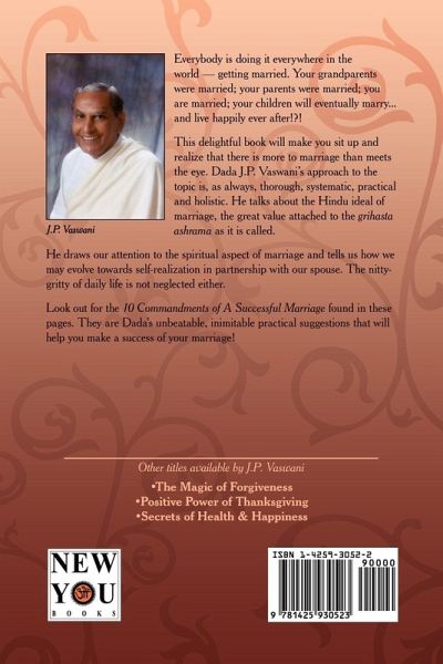 Everybody is doing it everywhere in the world - getting married. So you might be pardoned for thinking that it's all in a day's work for you: your grandparents were married; your parents were married; you are married; so your children will eventually marry... and live happily ever after!?! This delightful book will make you sit up and realise that there is more to marriage than meets the eye. Dada J.P. Vaswani's approach to the topic is, as always, thorough, systematic, practical and holistic. He talks about the Hindu ideal of marriage, the great value attached to the grihasta ashrama as it is called. He draws our attention to the spiritual aspect of marriage and tells us how we may evolve towards self-realization in partnership with our spouse. The nitty-gritty of daily life is not neglected either. Look out for the 10 Commandments of A Successful Marriage found in these pages. They are Dada's unbeatable, inimitable practical suggestions that will help you make a success of your marriage!