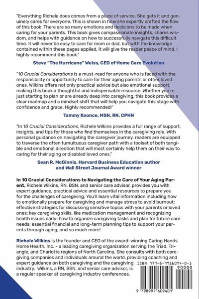 In 10 Crucial Considerations to Navigating the Care of Your Aging Parent, Richele Wilkins, RN, BSN, and senior care advisor, provides you with expert guidance, practical advice and essential resources to prepare you for the challenges of caregiving. You'll learn vital information including how to emotionally prepare for caregiving and manage stress to avoid burnout; effective strategies for discussing sensitive topics with your parents or loved ones; key caregiving skills, like medication management and recognizing health issues early; how to organize caregiving tasks and plan for future care needs; essential financial and long-term planning tips to support your parents through aging; and so much more!