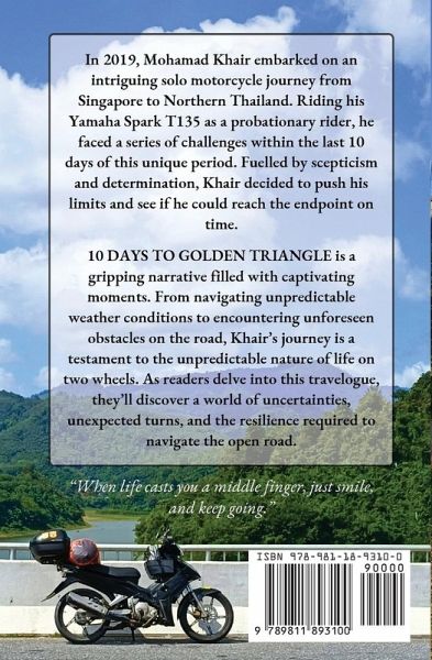 In 2019, Mohamad Khair embarked on an intriguing solo motorcycle journey from Singapore to northern Thailand. Riding his Yamaha Spark T135 as a probationary rider, he faced a series of challenges within the last 10 days of this unique period. Fuelled by scepticism and determination, Khair decided to push his limits and see if he could reach the endpoint on time. 10 DAYS TO GOLDEN TRIANGLE is a gripping narrative filled with captivating moments. From navigating unpredictable weather conditions to encountering unforeseen obstacles on the road, Khair's journey is a testament to the unpredictable nature of life on two wheels. As readers delve into this travelogue, they'll discover a world of uncertainties, unexpected turns, and the resilience required to navigate the open road.
