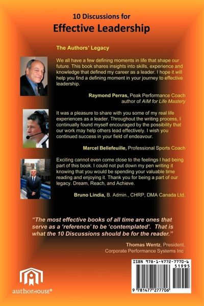 This is the second book from the lead author, Raymond Perras. Teaming up with two leadership coaching clients (Marcel Bellefeuille from the world of professional sports, and Bruno Lindia, a CEO and business owner), Raymond has developed a unique and groundbreaking effort to bring forward some issues that do not often get dealt with in a leadership book. Based on the concept of Peak Performance (the right stuff, in the right amount, at the right timeTM), this work provides a leader with insight into how to maximize results while reducing stress. Modern organizations need effective leaders. It is no longer sufficient to have the most advanced technology or systems to achieve maximum performance. There is growing evidence that future gains in productivity will only come from the people that do the work. Accordingly, the emphasis must now be on the human potential and not the hardware and systems. Extensive research by the Zenger-Folkman Group has produced very sobering results showing that organizations that are exceeding expectations and beating competition have a very definite focus on developing their leadership skills and abilities. They enable and empower their workforce to act with initiative, commitment to the goals and harmony in the group. Zenger-Folkman found that organizations that foster effective leadership increased some results over less successful ventures as follows: ¿ reduced turnover by 50% ¿ 3-5 times higher profits ¿ 2-3 times higher employee engagement ¿ 150% increased customer satisfaction ¿ 4-5 times more employees willing to go the extra mile. Clearly, effective leadership is the key to superior performance at this time. In the 10 Discussions for Effective Leadership, the authors share their experience on ten activities that can make or break a leader. By doing the right thing, practicing empowerment, trusting your team, telling the truth, planning jointly, defining your vision and sharing it, leading by example, asking good questions, thinking like a champion, and remembering that your are "alone at the top", you can ensure that you will be an effective leader. This book aims at providing a no nonsense discussion of activities that make a big difference for leaders seeking to increase their effectiveness and exceed their expectations. It calls for "contemplation" of ways and means to transform the context and content of their leadership activities in order to enable their teams to dramatically improve their results.
