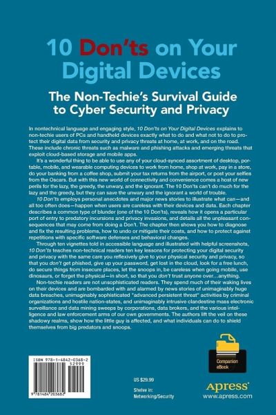 0 Don ts employs personal anecdotes and major news stories to illustrate what can and all too often does happen when users are careless with their devices and data. Each chapter describes a common type of blunder (one of the 10 Don ts), reveals how it opens a particular port of entry to predatory incursions and privacy invasions, and details all the unpleasant consequences that may come from doing a Don t. The chapter then shows you how to diagnose and fix the resulting problems, how to undo or mitigate their costs, and how to protect against repetitions with specific software defenses and behavioral changes.