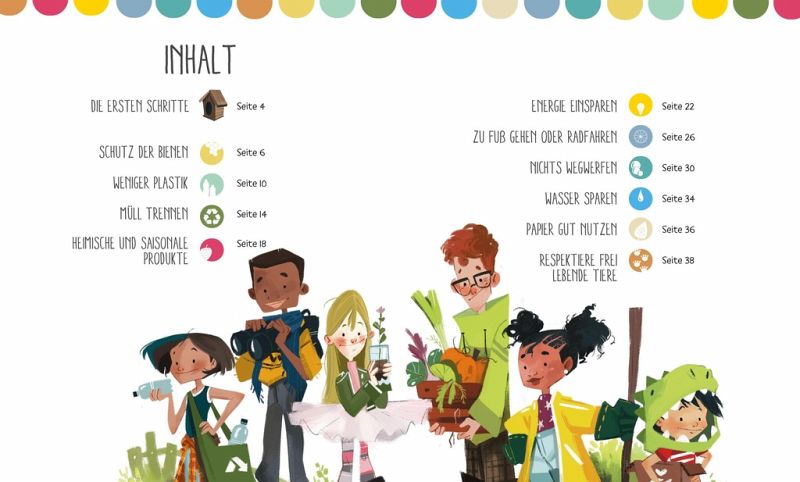 Die ersten Schritte 01 Die Bienen schützen02 Weniger Plastik verbrauchen03 Möglichst viel recyceln04 Wertschätzung lokaler und saisonaler Produkte05 Energie sparen06 Zu Fuß gehen und Fahrrad fahren07 Abfall vermeiden08 Wasser sparen09 Kein Papier verschwenden10 Respekt für die Tierwelt