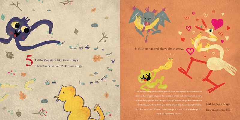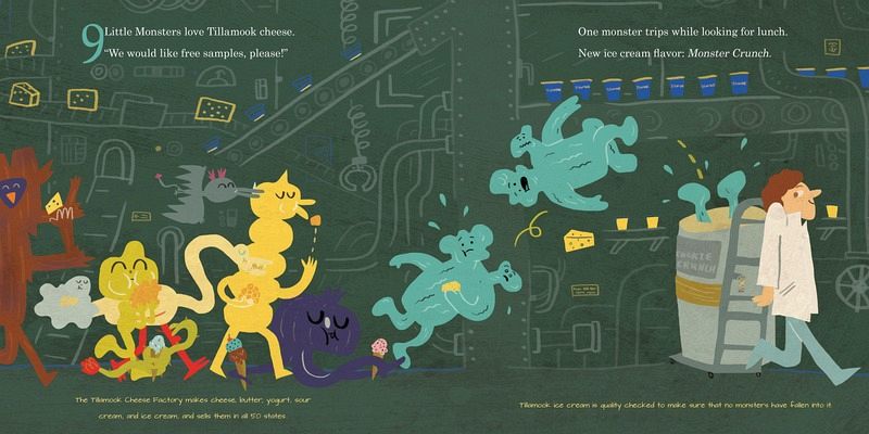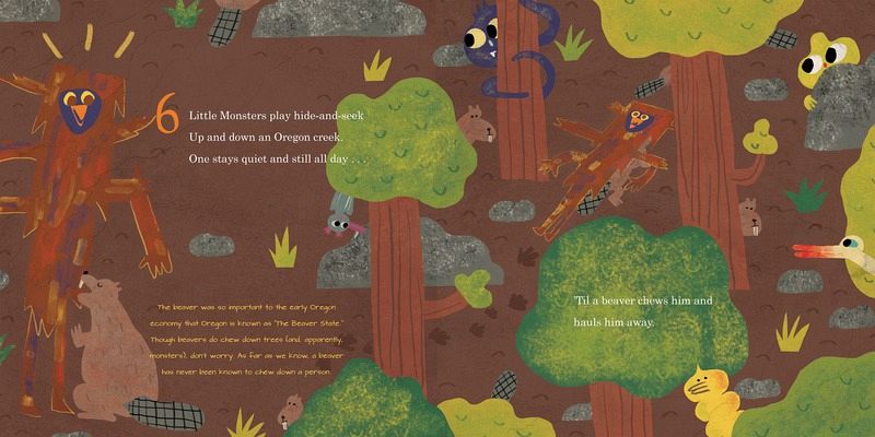 From the Astoria Column and Crater Lake to Tillamook Cheese and Powell's Books, these 10 Little Monsters discover some of the most unique and interesting things about Oregon and what it has to offer. Silly, over-the-top fun, and a bit macabre, 10 Little Monsters Visit Oregon is the perfect book for every little boy and ghoul! 9 Little Monsters love Tillamook cheese "We would like free samples please!" One monster trips while looking for lunch. New ice cream flavor, "Monster Crunch" 6 Little Monsters play hide-and-seek Up and down an Oregon creek. One stays quiet and still all day Til a beaver chews him and hauls him away. 1 Little Monster decides to go To ride and rope in a rodeo. He can't hold on. See him fly! Poor Little Monster. Wave goodbye!