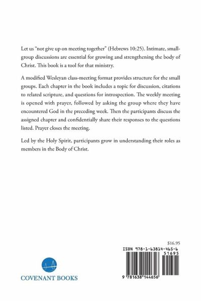 Let us "not give up on meeting together" (Hebrews 10:25). Intimate, small-group discussions are essential for growing and strengthening the body of Christ. This book is a tool for that ministry. A modified Wesleyan class-meeting format provides structure for the small groups. Each chapter in the book includes a topic for discussion, citations to related scripture, and questions for introspection. The weekly meeting is opened with prayer, followed by asking the group where they have encountered God in the preceding week. Then the participants discuss the assigned chapter and confidentially share their responses to the questions listed. Prayer closes the meeting. Led by the Holy Spirit, participants grow in understanding their roles as members in the Body of Christ.