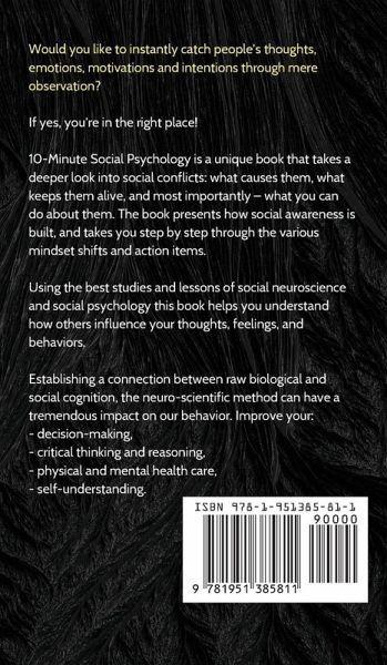 Would you like to instantly catch people’s thoughts, emotions, motivations and intentions through mere observation? If yes, you’re in the right place! 10-Minute Social Psychology is a unique book that takes a deeper look into social conflicts: what causes them, what keeps them alive, and most importantly – what you can do about them. The book presents how social awareness is built, and takes you step by step through the various mindset shifts and action items. Using the best studies and lessons of social neuroscience and social psychology this book helps you understand how others influence your thoughts, feelings, and behaviors. Establishing a connection between raw biological and social cognition, the neuro-scientific method can have a tremendous impact on our behavior. Improve your: - decision-making, - critical thinking and reasoning, - physical and mental health care, - self-understanding. 10-Minute Social Psychology addresses social concerns such as discrimination, in- and out-group dynamics, competition-cooperation, social acceptability, and likability, using neuroscience and social psychology-backed data, giving guidelines and critical thinking practices to diminish these concerns. Learn to predict and change others’ and our own behavior. - How our understanding of social behavior can be expanded and improved? - How do social processes impact the human brain? - Which brain areas implement social behavior? Can we influence them? Become more likable by becoming more empathetic. -Tame the social categorization muscle in dimensions like gender, race, or age. - What is the cost of social stress? - How to become better at cooperation and competition? - How to become less susceptible to social influence? Humans are social creatures – our health and well-being partially depend on others. 10-Minute Social Psychology helps you to understand the critical function of how we make sense of and connect with people.