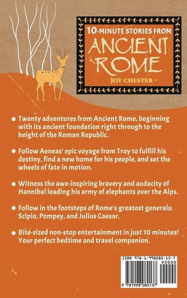 Treat your kids to these quick 10-minute action-packed legends from Ancient Rome! Studies have shown that developing an "atomic habit"-just a few minutes a day of whatever skill or habit you want to take on-can be more than enough to engrain it into our lives. Therefore, we have transformed timeless, legendary stories into 10-minute bite-size chunks long enough to entertain, enthrall, and even educate the listener but short enough to be enjoyed quickly at bedtime or any other point in our busy modern days. Twenty adventures from Ancient Rome, beginning with its ancient foundation right through to the height of the Roman Republic. Follow Aeneas' epic voyage from Troy to fulfill his destiny, find a new home for his people, and set the wheels of fate in motion. Witness the awe-inspiring bravery and audacity of Hannibal leading his army of elephants over the Alps. Follow in the footsteps of Rome's greatest generals: Scipio, Pompey, and Julius Caesar. Bite-sized non-stop entertainment in just 10 minutes! Timeless classic stories for kids to enjoy, helping young ones learn while having fun. Your perfect bedtime and travel companion-these short stories are excellent for you and your child to spend quality time together whenever and wherever you want! And much more. Some more gruesome or brutal details have been left aside, lying ready in the original meanings, and are 100 percent kid-friendly without losing their magical charm.