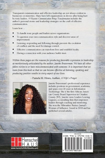 Transparent communication and effective leadership are not always evident in businesses or ministries. Many have left organizations in droves after being hurt by toxic leaders. 10 Reasons Communication Brings Transformation includes Janette Braverman’s personal stories and leadership strategies on the craft of effective communication. Learn how ... · To handle toxic people and leaders across organizations. · To question your own communication style and discover areas of improvement. · Listening, responding and following through prevents the escalation of conflicts and the need for damage control. · Effective communication can transform lives and establish loyalty. · Having a connection with your audience builds trust.