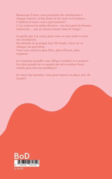 Beaucoup d'entre vous prennent des résolutions à chaque rentrée, le but étant de les tenir et d'avancer...Combien d'entre vous y parviennent?C'est toujours la même histoire : vus êtes paré de bonnes intentions ... qui ne durent jamais dans le temps !Le guide que j'ai conçu pour vous va vous aider à tenir vos résolutions.En mettant en pratique mes 10 rituels, votre vie va changer au quotidien.Vous vous sentirez plus libre, plus efficace, plus organisé.La situation actuelle vous oblige à évoluer et à avancer.Les plus grands de ce monde ont mis en place leurs rituels pour être les meilleurs?Et vous? Qu'attendez-vous pour mettre en place mes 10 rituels?