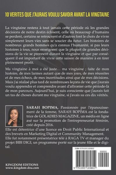 10 VERITES QUE J'AURAIS VOULU SAVOIR AVANT LA VINGTAINE La vingtaine restera à tout jamais cette période où les grandes décisions de notre destin éclosent, celle où beaucoup d'humains se perdent, certains se retrouvent et d'autres font le choix de vivre simplement leurs vies sans se soucier du futur. Les histoires de nombreux grands hommes qu'a connus l'humanité, si pas leurs histoires à tous, nous enseignent que la plupart de grandes décisions de la vie se prennent durant la vingtaine et que par conséquent il est important de vivre cette saison de manière à en tirer pleinement profit. Ma vingtaine à moi a été juste... ma vingtaine; faite de mon histoire, de mes larmes autant que de mes joies, de mes réussites et de mes échecs, de mes incertitudes ainsi que de mes décisions. Mais j'ai réalisé plus tard de nombreuses leçons de vie que j'aurais voulu apprendre et comprendre avant d'affronter cette période-là de mon parcours. Aujourd'hui, je suis consciente que j'aurais fait un tas de choses durant ma vingtaine, si j'avais su ces dix vérités. SARAH BOPIMA Passionnée par l'épanouissement de la femme, SARAH BOPIMA est la fondatrice de GOLADIES MAGAZINE, un média en ligne axé sur la promotion de l'entrepreneuriat féminin, créé depuis 2016. Elle est détentrice d'une licence en Droit Public International et des brevets en Marketing Digital et Community Management. Elle fut notamment présentatrice télé à RAGA TV et manager du projet BIBI DIGI, un programme porté sur la jeune fille et le digital.
