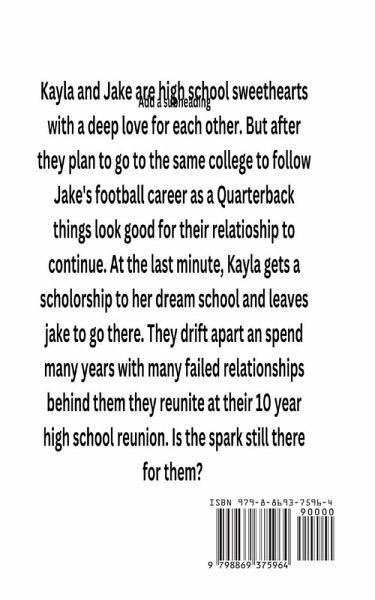 Kayla and Jake are high school sweethearts with a deeplove for each other. But after they plan to go to the samecollege to follow Jake's football career as a quarterback.Things look good for their relationship to continue. At thelast minute, Kayla gets a scholarship to her dream schooland leaves Jake to go there. They drift apart and spendmany years with many failed relationships behind them.They reunite at their 10-year reunion.Is the spark still there for them?