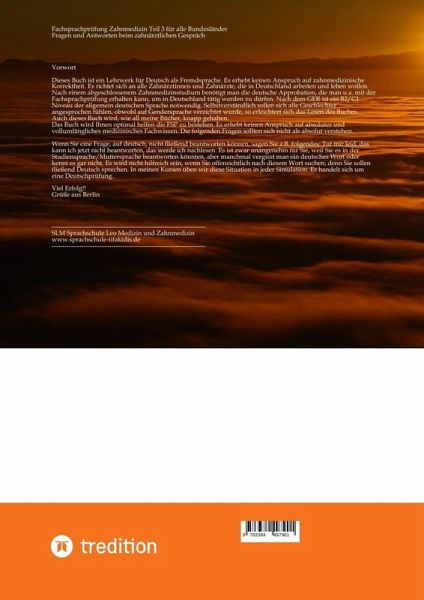 Fachsprachprüfung Zahnmedizin Teil 3 für alle Bundesländer Fragen und Antworten beim zahnärztlichen GesprächVorwortDieses Buch ist ein Lehrwerk für Deutsch als Fremdsprache. Es erhebt keinen Anspruch auf zahnmedizinische Korrektheit. Es richtet sich an alle Zahnärztinnen und Zahnärzte, die in Deutschland arbeiten und leben wollen. Nach einem abgeschlossenem Zahnmedizinstudium benötigt man die deutsche Approbation, die man u.a. mit der Fachsprachprüfung erhalten kann, um in Deutschland tätig werden zu dürfen. Nach dem GER ist ein B2/C1 Niveau der allgemein deutschen Sprache notwendig. Selbstverständlich sollen sich alle Geschlechter angesprochen fühlen, obwohl auf Gendersprache verzichtet wurde, so erleichtert sich das Lesen des Buches.Auch dieses Buch wird, wie all meine Bücher, knapp gehalten.Das Buch wird Ihnen optimal helfen die FSP zu bestehen. Es erhebt keinen Anspruch auf absolutes und vollumfängliches medizinisches Fachwissen. Die folgenden Fragen sollten sich nicht als absolut verstehen.Wenn Sie eine Frage, auf deutsch, nicht fließend beantworten können, sagen Sie z.B. folgendes: Tut mir leid, das kann ich jetzt nicht beantworten, das werde ich nachlesen. Es ist zwar unangenehm für Sie, weil Sie es in der Studiensprache/Muttersprache beantworten könnten, aber manchmal vergisst man ein deutsches Wort oder kennt es gar nicht. Es wird nicht hilfreich sein, wenn Sie offensichtlich nach diesem Wort suchen, denn Sie sollen fließend Deutsch sprechen. In meinen Kursen üben wir diese Situation in jeder Simulation. Es handelt sich um eine Deutschprüfung.Viel Erfolg!!Grüße aus Berlin------------------------------------------------------------------------SLM Sprachschule Leo Medizin und Zahnmedizinwww.sprachschule-tifakidis.de------------------------------------------------------------------------