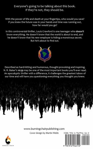 A deadly virus. An over-populated world. An impossible decision. The clock is ticking to the end of the world; and we're already at 10:59. The most important book you'll read this year. An apocalyptic thriller with a difference, 10:59 by NR Baker will have you questioning everything - and everyone - you thought you knew. If you held the lives of those around you in your hands, who would you save? And could you live with sentencing others to certain death? When teenager Louis Crawford is asked to come up with an idea that will change the world, his answer is both shocking and simple. And it is a solution that will change everything, forever. Louis finds himself thrust into the middle of an organisation that has the power to save the world. But are its motives pure? And can he live with the price that humanity must pay?