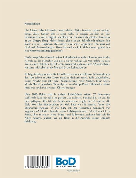 Reiseübersicht184 Länder habe ich bereist, meist alleine. Einige intensiv, andere weniger. Einige dieser Länder gibt es nicht mehr. In einigen Ländern ist eine Individualreise nicht möglich, da bleibt nur der staatlich gelenkte Tourismus in der Gruppe übrig. Meine Reisen plane ich am Schreibtisch zuhause. Ich buche nur ein Flugticket, alles andere wird vorort organisiert. Das spart viel Geld und Überraschungen. Wenn ich wieder auf die Welt komme, gründe ich eine Reiseveranstaltungsgesellschaft. Große Ansprüche während meiner Individualreisen stelle ich nicht, mir ist der Kontakt zu den Menschen und deren Kultur wichtig. Zur Not schlafe ich auch mal in einer Holzhütte für 30 Cent, manchmal auch in einem 5-Sterne-Hotel. Ich passe mich eben an die Mentalität des Reiselandes an.Richtig süchtig geworden bin ich während meines beruflichen Aufenthaltes in den 80er Jahren in USA. Dieses Land ist ideal zum Reisen. Tolle Landschaften, wenig Verkehr trotz sehr guter Beschilderung, breite Straßen, kaum Staus, Motels überall, grandiose Nationalparks, vernünftige Preise, hilfsbereite, offene Menschen und immer wieder Überraschungen.Über 1000 Reisen sind in meinen Reisebüchern erfasst. 77 Fernreisen (außerhalb Europas) habe ich geplant und realisiert. Fünfmal bin ich um die Erde geflogen, zähle ich alle Reisen zusammen, ergibt das 45 mal um die Welt. Von allen Hauptstädten der Welt habe ich 158 besucht, ferner 205 Millionenmetropolen. 34 mal habe ich den asiatischen Kontinent mit insgesamt 42 Ländern besucht, mein Lieblingskontinent. 20 mal war ich in Afrika, über 30 mal in Nord-, Mittel- und Südamerika. Sechsmal habe ich die Arktis besucht, jedoch war die Reise in die Antarktis meine schönste Erfahrung.Dabei habe ich 49 islamische Länder (von 56) kennengelernt. 125 Inseln (Galapagos, Hawaii, Grönland, Bali) der Erde gehören zu meinem Repertoire. Während fast 800 Flügen musste ich 89 Nächte verbringen. Ähnlich auch auf meinen vielen Schiffsreisen sind 71 Nächte und bei meinen Bahnreisen alleine 31 Nächte zu nennen. Mein Vater war Eisenbahnbeamter... Mein erstes Flugticket kostete 2.70 US $ auf der kürzesten Flugstrecke in Europa von Kopenhagen nach Malmö am 27.12.1960. Damals war ich noch Lehrling und verdiente 30 DM im Monat.