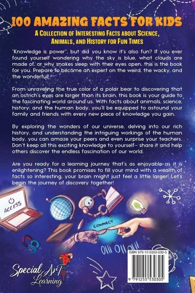 Discover fun facts for kids in this amazing knowledge-packed book! If you've ever wondered why the sky is blue, what clouds are made of, or why snakes sleep with their eyes open, this is the perfect read for you. Get ready to become an expert on the weird, the wacky, and the wonderful! Unravel the true color of a polar bear and learn that an ostrich's eyes are larger than its brain in this fascinating guide to the world around us. From captivating history to mind-boggling science facts and intriguing details about the human body, you'll astound your family and friends with every new piece of knowledge you gain. So, are you ready to expand your mind and have fun along the way? Get your copy now and let's embark on an adventure of discovery together! Perfect for kids ages 8-12 or for those who just love learning! Get this as birthday gifts or stocking stuffers - this book promises to engage young minds and make them feel just a little smarter!