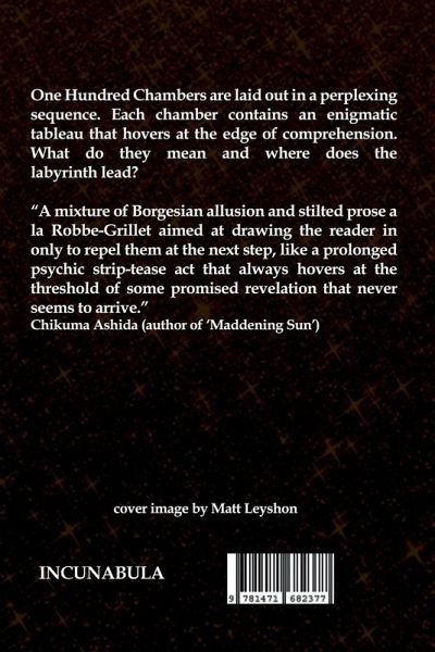 One Hundred Chambers are laid out in a perplexing sequence. Each chamber contains an enigmatic tableau that hovers at the edge of comprehension. What do they mean and where does the labyrinth lead? "A mixture of Borgesian allusion and stilted prose a la Robbe-Grillet aimed at drawing the reader in, only to repel them at the next step, like a prolonged psychic strip-tease act that always hovers at the threshold of some promised revelation that never seems to arrive." (Chikuma Ashida - author of 'Maddening Sun')