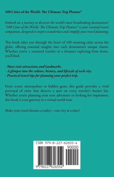 100 Cities of the World: The Ultimate Trip Planner" Embark on a journey to discover the world's most breathtaking destinations! *100 Cities of the World: The Ultimate Trip Planner* is your essential travel companion, designed to inspire wanderlust and simplify your travel planning. This book takes you through the heart of 100 stunning cities across the globe, offering essential insights into each destination's unique charm. Whether you're a seasoned traveler or a dreamer exploring from home, you'll find: - Must-visit attractions and landmarks. - A glimpse into the culture, history, and lifestyle of each city. - Practical travel tips for planning your perfect trip. From iconic metropolises to hidden gems, this guide provides a vivid portrayal of cities that deserve a spot on every traveler's bucket list. Whether you're planning your next adventure or looking for inspiration, this book is your gateway to a virtual world tour. Make your travel dreams a reality-one city at a time!