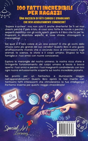 Scopri tanti fatti divertenti e istruttivi per bambini in questo fantastico libro! Se ti sei mai chiesto perché il cielo è blu, di cosa sono fatte le nuvole o perché i serpenti dormono con gli occhi aperti, questo è il libro che fa per te. Preparati a diventare esperto di cose strane, stravaganti e meravigliose! Sai qual è il vero colore di un orso polare? O che gli occhi dello struzzo sono più grandi del suo cervello? In questa affascinante guida al nostro pianeta scoprirai avvincenti eventi storici, sbalorditivi fatti scientifici e dettagli intriganti sul corpo umano. Sorprendi la tua famiglia e i tuoi amici con nuove conoscenze! Sei pronto a espandere la tua mente e a divertirti? Acquista subito la tua copia e parti insieme a noi per un'avventura unica! Perfetto per bambini dagli 6 ai 12 anni o per chi semplicemente ama imparare! Ideale come regalo di compleanno o di Natale: un libro che conquisterà l'interesse dei piccoli lettori e stimolerà la loro intelligenza