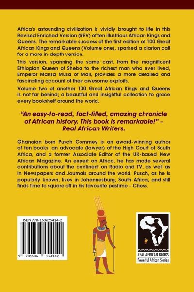 Africa's astounding civilization is vividly brought to life in this Revised Enriched Edition of ten illustrious African Kings and Queens, spanning 4000 years. The remarkable success of the first edition of 100 Great African Kings and Queens ( Volume one ), sparked a clarion call for a more in-depth version. This version, spanning the same cast, from the magnificent Ethiopian Queen of Sheba, to the richest man who ever lived, Emperor Mansa Musa of Mali, provides a more detailed and fascinating account of their awesome exploits. They are complemented with new amazing images. Volume two of another ten of 100 Great African Kings and Queens is not far behind; a beautiful and insightful collection to grace every bookshelf around the world.