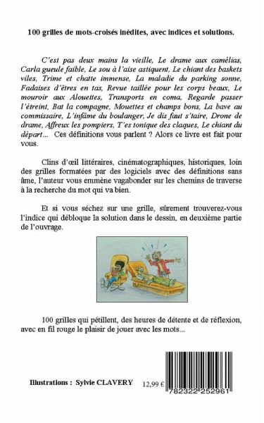 Recueil de 100 grilles de mots-croisés inédites, avec indices et solutions.C'est pas deux mains la vieille, Le drame aux camélias, Carla gueule faible, Le sou à l'aise astiquent, Trime et chatte immense, Le chiant des baskets viles, La maladie du parking sonne, Fadaises d'êtres en tas, Mouettes et champs bons, Revue taillée pour les corps beaux, Le mouroir aux Alouettes, Transport en coma, Regarde passer l'étreint, Bat la compagne, Affreux les pompiers, T'es tonique des claques, Le chiant du départ...Ces définitions vous parlent ? Alors ce livre est pour vous.Clins d'oeil littéraires, cinématographiques, historiques, loin des grilles formatées par des logiciels avec des définitions sans âme, l'auteur vous emmène vagabonder sur les chemins de traverse à la recherche du mot qui va bien.Et si vous séchez sur un problème, sûrement trouverez-vous l'indice qui débloque la solution dans le dessin, en deuxième partie de l'ouvrage.100 grilles qui pétillent, des heures de détente et de réflexion, avec en fil rouge le plaisir de jouer avec les mots...