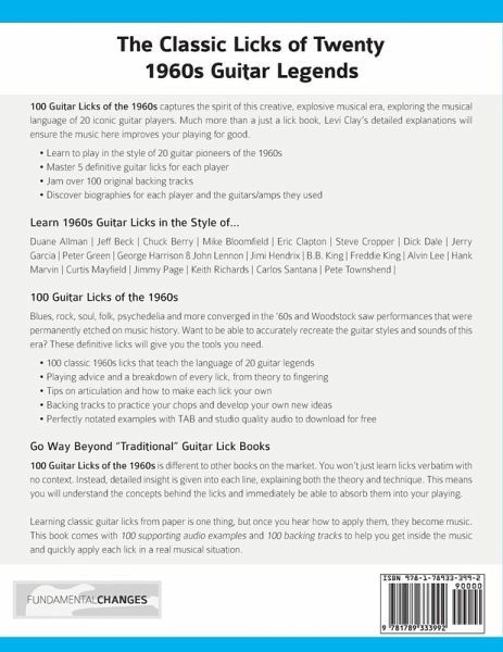The Classic Licks of Twenty 1960s Guitar Legends Do you want to get deep into the musical guitar sounds of the 1960s? The 1960s was one of the most creative and explosive decades in music history. Blues-rock, jam-band culture, surf, Woodstock, the hippie movement and more! It was a cultural melting pot where music and art became accessible to everyone - and spawned some of the most influential guitar players of all time. 100 Guitar Licks of the 1960s captures the spirit of the era, exploring the musical language of 20 iconic guitar players. Much more than a just a lick book, Levi Clay's detailed explanations will ensure the music here improves your playing for good. Learn to play in the style of 20 guitar pioneers of the 1960s Master 5 definitive guitar licks for each player Jam over 100 original backing tracks Discover biographies for each player and the guitars/amps they used Learn 1960s Guitar Licks in the Style of... Duane Allman Jeff Beck Chuck Berry Mike Bloomfield Eric Clapton Steve Cropper Dick Dale Jerry Garcia Peter Green George Harrison & John Lennon Jimi Hendrix B.B. King Freddie King Alvin Lee Hank Marvin Curtis Mayfield Jimmy Page Keith Richards Carlos Santana Pete Townshend