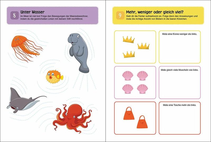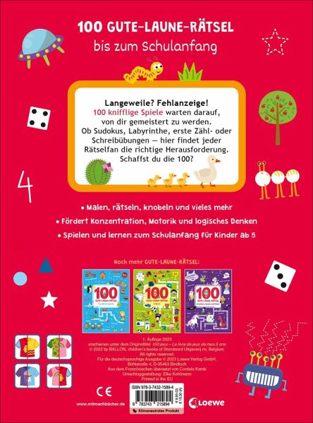 100 knifflige Spiele warten darauf, von dir gemeistert zu werden. Ob Sudokus, Labyrinthe, erstes Zählen oder Schreiben - hier findet jeder Rätselfan die richtige Herausforderung. Schaffst du die 100? Malen, rätseln, knobeln und vieles mehrFördert Konzentration, Motorik und logisches DenkenSpielen und lernen zum Schulanfang für Kinder ab 5 Jahren