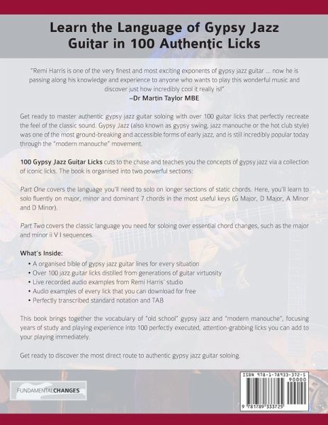Remi Harris' 100 Gypsy Jazz Guitar Licks If you're looking for the most direct pathway to learn incredible gypsy jazz guitar soloing - here it is! "Remi Harris is one of the very finest and most exciting exponents of gypsy jazz guitar ... now he is passing along his knowledge and experience to anyone who wants to play this wonderful music and discover just how incredibly cool it really is!" - Dr Martin Taylor MBE Get ready to master authentic gypsy jazz guitar soloing with over 100 guitar licks that perfectly recreate the feel of the classic sound. · Would you like to play effortless hot club style guitar solos? · Want to build a vocabulary of authentic gypsy jazz guitar licks that work perfectly, every single time? · Do you want to master the language of guitar Django Reinhardt, Biréli Lagrène, and many more? Gypsy Jazz (also known as gypsy swing, jazz manouche or the hot club style) was one of the most ground-breaking and accessible forms of early jazz, and is still incredibly popular today through the "modern manouche" movement. However, it typically doesn't lend itself to the kind of music theory that most guitarists are used to playing. 100 Gypsy Jazz Guitar Licks cuts right to the chase with an overview of how gypsy jazz guitarists think when they solo, then dives straight in to teach every concept via 100 iconic licks. You'll be sounding like an authentic gypsy jazz guitar player in no time at all.