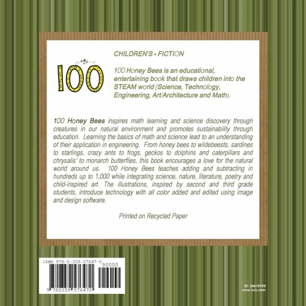 100 Honey Bees is an educational, entertaining book that draws children into the STEAM world (Science, Technology, Engineering, Art/Architecture and Math). 100 Honey Bees inspires math learning and science discovery through creatures in our natural environment and promotes sustainability through education. Learning the basics of math and science lead to an understanding of their application in engineering. From honey bees to wildebeests, sardines to starlings, crazy ants to frogs, geckos to dolphins and caterpillars and chrysalis' to monarch butterflies, this book encourages a love for the natural world around us. 100 Honey Bees teaches adding and subtracting in hundreds up to 1,000 while integrating science, nature, literature, poetry and child-inspired art. The illustrations, inspired by second and third grade students, introduce technology with all color added and edited using image design software.