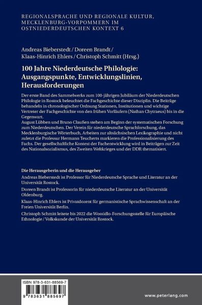 August Lübben und Bruno Claußen stehen am Beginn der systematischen Forschung zum Niederdeutschen. Der Verein für niederdeutsche Sprachforschung, das Mecklenburgische Wörterbuch, Arbeiten zur altsächsischen Lexikographie und nicht zuletzt die Professur Hermann Teucherts markieren die Professionalisierung des Fachs. Der gesellschaftliche Kontext der Fachentwicklung wird in Beiträgen zur Zeit des Nationalsozialismus, des Zweiten Weltkrieges und der DDR thematisiert.