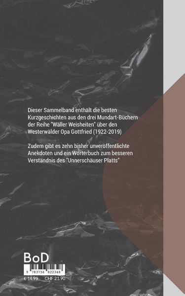 Dieser Sammelband enthält die besten Kurzgeschichten aus den drei Mundart-Büchern der Reihe "Wäller Weisheiten" über den Westerwälder Opa Gottfried (1922-2019). Darüber hinaus gibt es zehn bisher unveröffentlichte Anekdoten und ein Wörterbuch zum besseren Verständnis des "Unnerschäuser Platts".