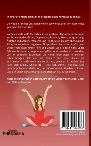 In einer orientierungslosen Welt ist der beste Kompass du selbst!Die virale Krise hat uns neben vielen Schwierigkeiten vor allem eines gebracht: Erkenntnisse!Corona stürzte viele Menschen in ein noch nie dagewesenes Ausmaß an Beziehungskonflikten, Depression, Burnout, Stress, Ausgrenzung, Ängsten und Sorgen. Probleme und Hindernisse, die uns aber auch im Alltag immer wieder begegnen. Einiges davon hat unser Kopf schnell wieder vergessen, unser Herz und unsere Seele jedoch nicht. Jeder Schmerz ist dazu da, angesehen, gefühlt und verarbeitet zu werden, um ihn endgültig aufzulösen. Die Herausforderungen in unserem Leben bringen nicht nur Leid, sondern auch eine Chance auf Wachstum mit sich, wenn wir bereit sind, genauer hinzusehen. Das Buch »100 Krisen meistern - Finde dich selbst« gibt zahlreiche neue Impulse und Methoden, um seinen inneren Frieden zu finden und sich selbst als wahrhaftige Schöpferkraft neu zu erkennen.Nutze die universellen Gesetze, um dir ein Leben voller Liebe,Glück und Fülle zu kreieren.