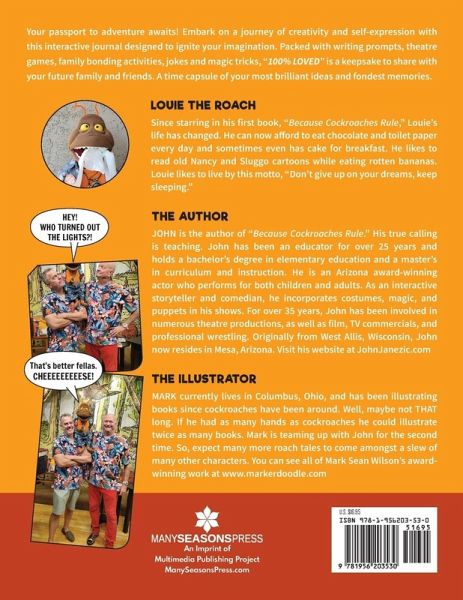 Your passport to adventure awaits! Embark on a journey of creativity and self-expression with this interactive journal designed to ignite your imagination. Packed with writing prompts, theatre games, family bonding activities, jokes and magic tricks, "100% Loved" is a keepsake to share with your future family and friends. A time capsule of your most brilliant ideas and fondest memories. LOUIE THE ROACH Since starring in his first book, "Because Cockroaches Rule," Louie's life has changed. He can now afford to eat chocolate and toilet paper every day and sometimes even has cake for breakfast. He likes to read old Nancy and Sluggo cartoons while eating rotten bananas. Louie likes to live by this motto, "Don't give up on your dreams, keep sleeping."