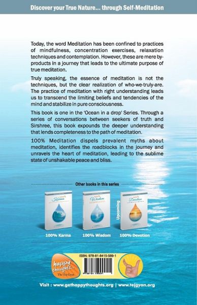 Discover your True Nature... through Self-Meditation Today, the word Meditation has been confined to practices of mindfulness, concentration exercises, relaxation techniques and contemplation. However, these are mere by-products in a journey that leads to the ultimate purpose of true meditation. Truly speaking, the essence of meditation is not the techniques, but the clear realization of who-we-truly-are. The practice of meditation with right understanding leads us to transcend the limiting beliefs and tendencies of the mind and stabilize in pure consciousness. This book is one in the 'Ocean in a drop' Series. Through a series of conversations between seekers of truth and Sirshree, this book expounds the deeper understanding that lends completeness to the path of meditation. 100% Meditation dispels prevalent myths about meditation, identifies the roadblocks in the journey and unravels the heart of meditation, leading to the sublime state of unshakable peace and bliss.