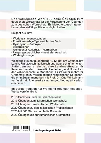 Das vorliegende Werk 100 neue Übungen zum deutschen Wortschatzist die Fortsetzung von Übungen zum deutschen Wortschatz. Es bietetfortgeschrittenen Lernenden vielfältige Übungsmöglichkeiten.Es geht z.B. um- Wortzusammensetzungen- Funktionsverbgefüge - einfaches Verb- Synonyme - Antonyme- Alliterationen- Gehobener Ausdruck - Normalwort- Umgangssprachlicher - neutraler Ausdruck- Wortergänzungen