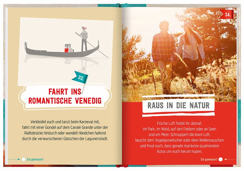 Welche Orte wollen Sie und Ihr Partner unbedingt mal besuchen? Und was war der schönste, romantischste oder abenteuerlichste Ort, an dem Sie bisher gemeinsam gewesen sind? Dieses Buch gibt Ihnen Tipps für viele weitere Orte, die Sie zusammen besuchen sollten. Dabei geht es nicht nur um Reiseziele wie Venedig oder Paris, sondern auch um alltägliche Orte wie "samstags im Baumarkt" und abstrakte Ideen, zum Beispiel "die eigene Zukunft". Das bringt Abwechslung in jede Beziehung! Gemeinsame Ausflüge und lustige Unternehmungen machen nicht nur Spaß, sondern schweißen Sie und Ihren Partner auch noch enger zusammen.