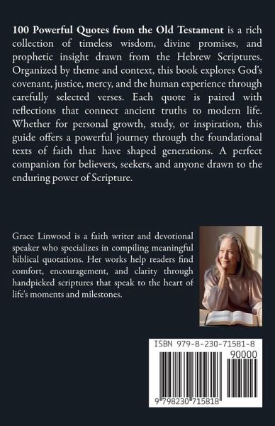 100 Powerful Quotes from the Old Testament is a rich collection of timeless wisdom, divine promises, and prophetic insight drawn from the Hebrew Scriptures. Organized by theme and context, this book explores God's covenant, justice, mercy, and the human experience through carefully selected verses. Each quote is paired with reflections that connect ancient truths to modern life. Whether for personal growth, study, or inspiration, this guide offers a powerful journey through the foundational texts of faith that have shaped generations. A perfect companion for believers, seekers, and anyone drawn to the enduring power of Scripture.