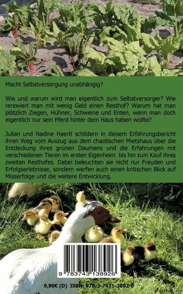 Macht Selbstversorgung unabhängig?Wie und warum wird man eigentlich zum Selbstversorger? Wie renoviert man mit wenig Geld einen Resthof? Warum hat man plötzlich Ziegen, Hühner, Schweine und Enten, wenn man doch eigentlich nur seine Pferde hinter dem Haus haben wollte?Julian und Nadine Haertl schildern in diesem Erfahrungsbericht ihren Weg vom Auszug aus dem chaotischen Mietshaus über die Entdeckung des grünen Daumens und die Erfahrungen mit verschiedenen Tieren im ersten Eigenheim bis hin zum Kauf ihres zweiten Resthofes. Dabei beleuchten sie nicht nur Freuden und Erfolgserlebnisse, sondern werfen auch einen kritischen Blick auf Misserfolge und die weitere Entwicklung.
