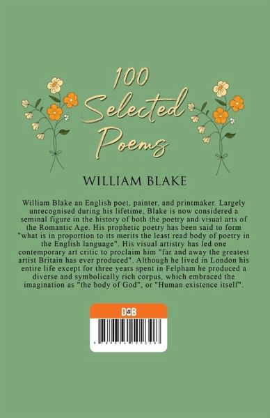 This books is a collection of poetry by WILLIAM BLAKE. He was an English poet, painter, and printmaker. Largely unrecognised during his life, Blake is now considered a seminal figure in the history of the poetry and visual art of the Romantic Age. What he called his "prophetic works" were said by 20th-century critic Northrop Frye to form "what is in proportion to its merits the least read body of poetry in the English language". His visual artistry led 21st-century critic Jonathan Jones to proclaim him "far and away the greatest artist Britain has ever produced". In 2002, Blake was placed at number 38 in the BBC's poll of the 100 Greatest Britons. While he lived in London his entire life, except for three years spent in Felpham, he produced a diverse and symbolically rich collection of works, which embraced the imagination as "the body of God" or "human existence itself".