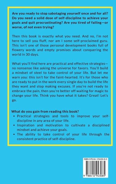 Are you ready to stop sabotaging yourself once and for all? Do you need a solid dose of self-discipline to achieve your goals and quit procrastinating? Are you tired of failing-or worse, of not even trying? Then this book is exactly what you need. And no, I'm not here to sell you fluff, nor am I some self-proclaimed guru. This isn't one of those personal development books full of flowery words and empty promises about conquering the world in 30 days. What you'll find here are practical and effective strategies-no nonsense like asking the universe for favors. You'll build a mindset of steel to take control of your life. But let me warn you: this isn't for the faint-hearted. It's for those who are ready to put in the work every single day to build the life they want and stop making excuses. If you're not ready to embrace the pain, then you're better off waiting for magic to change your life. Think you have what it takes? Great! Let's go. What Is 100% Self-Discipline About? It's a comprehensive guide to self-discipline, packed with practical techniques and insights for personal growth and achieving your goals. Whether it's about creating the life you've always wanted, ensuring financial stability for your family, earning the paycheck you need, smashing athletic goals, or escaping mediocrity, this book is your roadmap. What's In It For You?Practical strategies and tools to enhance your self-discipline in every area of your life. Motivation to develop a disciplined mindset and achieve your goals. The power to take control of your life through consistent practice of self-discipline. Who Is This Book For?Anyone seeking to improve their self-discipline and achieve personal or professional goals, including: Students, professionals, or entrepreneurs aiming to improve time management and productivity.