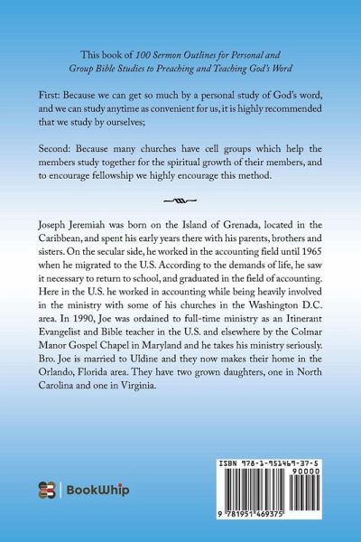 This book of 100 Sermon Outlines for Personal and Group Bible Studies to Preaching and Teaching God's Word First: Because we can get so much by a personal study of God's word, and we can study anytime as convenient for us, it is highly recommended that we study by ourselves; Second: Because many churches have cell groups which help the members study together for the spiritual growth of their members, and to encourage fellowship we highly encourage this method.