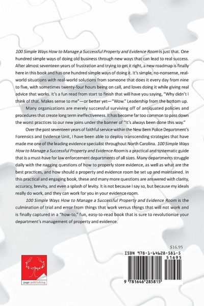 100 Simple Ways How to Manage a Successful Property and Evidence Room is just that. One hundred simple ways of doing old business through new ways that can lead to real success. After almost seventeen years of frustration and trying to get it right, a new roadmap is finally here in this book and has one hundred simple ways of doing it. It's simple, no-nonsense, real-world situations with real-world solutions from someone that does it every day from nine to five, with sometimes twenty-four hours being on call, and loves doing it while giving real advice that works. It's a fun read from start to finish that will have you saying, "Why didn't I think of that. Makes sense to me"-or better yet-"Wow." Leadership from the bottom up. Many organizations are merely successful surviving off of antiquated policies and procedures that create long term ineffectiveness. It has become far too common to pass down the worst practices to our new joins under the banner of "It's always been done this way." Over the past seventeen years of faithful service within the New Bern Police Department's Forensics and Evidence Unit, I have been able to deploy transcending strategies that have made me one of the leading evidence specialist throughout North Carolina. 100 Simple Ways How to Manage a Successful Property and Evidence Room is a practical and systematic guide that is a must-have for law enforcement departments of all sizes. Many departments struggle daily with the nagging questions of how to properly store evidence, as well as what are the best practices, and how should a property and evidence room be set up and maintained. In this practical and engaging book, these and many more questions are answered with clarity, accuracy, brevity, and even a splash of levity. It is not because I say so, but because my ideals really do work, and they can work for you in your evidence room. 100 Simple Ways How to Manage a Successful Property and Evidence Room is the culmination of trial and error from things that work versus things that will not work and is finally captured in a "how-to," fun, easy-to-read book that is sure to revolutionize your department's management of property and evidence.