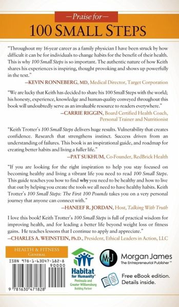 Through trial and error, tears and triumph, Keith "Temple" Trotter has lost over 150 pounds and kept it off for close to three years. "100 Small Steps" tells his personal story from the vantage point of his private journal notes. As people began to notice "Temple's" transformation, he wrote down the "Steps" that made sense and worked for him so as to be a catalyst for them. "Temple" freely and openly shares his pain and triumph. His amazing story has been featured on CNN.com and his blog has been read by viewers in over 80 countries.