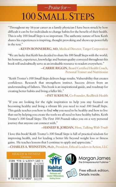 Through trial and error, tears and triumph, Keith "Temple" Trotter has lost over 150 pounds and kept it off for close to three years. "100 Small Steps" tells his personal story from the vantage point of his private journal notes. As people began to notice "Temple's" transformation, he wrote down the "Steps" that made sense and worked for him so as to be a catalyst for them. "Temple" freely and openly shares his pain and triumph. His amazing story has been featured on CNN.com and his blog has been read by viewers in over 80 countries.