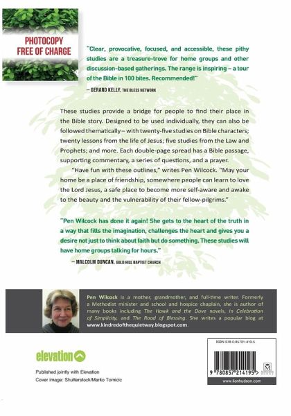 These studies provide a bridge for people to find their place in the Bible story. Designed to be used individually, they can also be followed thematically - with twenty-five studies on Bible characters; twenty lessons from the life of Jesus; five studies from the Law and Prophets, and more. Each double-page spread has a Bible passage, supporting commentary, a series of questions and a prayer. 'Have fun with these outlines,' writes Pen Wilcock. 'May your home be a place of friendship, somewhere people can learn to love the Lord Jesus, a safe place to become more self-aware and awake to the beauty and the vulnerability of their fellow-pilgrims.'