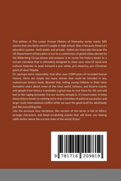 This edition of The Lesser Known History of Humanity series marks 500 stories that you likely weren't taught in high school. Was it because America's education system-both public and private-failed you miserably because the US Department of Education is run by a commission of global elites elected by the Bilderberg Group whose sole purpose is to revise the history books to a certain narrative that is ultimately designed to skew your view of racial and cultural histories to push forward a pro-white, pro-America, pro-Christian point of view? Maybe. Or, perhaps more reasonably, that after over 5,000 years of recorded human history, there are simply too many stories that could be included in any mainstream history book. Beyond that, telling young children in their most formative years about some of the most awful, heinous, and bizarre events and people from history is probably a great way to scar them for life and add fuel to the raging dumpster fire our society already is. It's much easier to keep those history books to nothing more than a timeline of political succession and large-scale international conflict while we save the good stuff for adulthood, just like everything else. Like the previous four iterations, this version of the series is full of killers, strange characters, and head-scratching events that will leave you feeling oddly better about the current state of the world. Enjoy!
